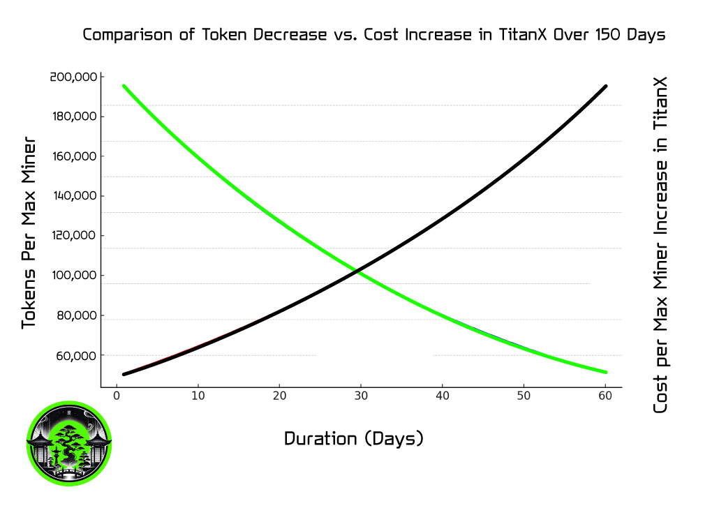Miner Tokens Decrease at a rate of 2.25% per Day and Increase at a rate of 1.75% in Cost of TitanX per Day to produce a Miner.